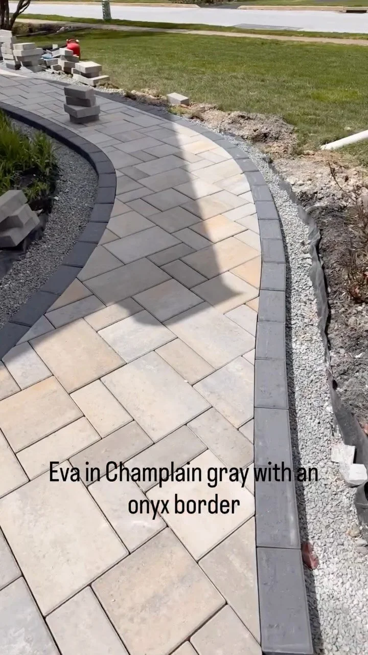 Elegant Techo-Bloc paver walkway with decorative edging stones, professionally installed to enhance curb appeal in Phoenixville.